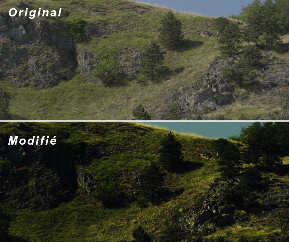 C’est en appliquant des LUT (Look-Up Table ou table de conversion colorimétrique : des préréglages de la colorimétrie), en modifiant les contrastes, et en augmentant les noirs dans l’image que l’on change une ambiance visuelle :