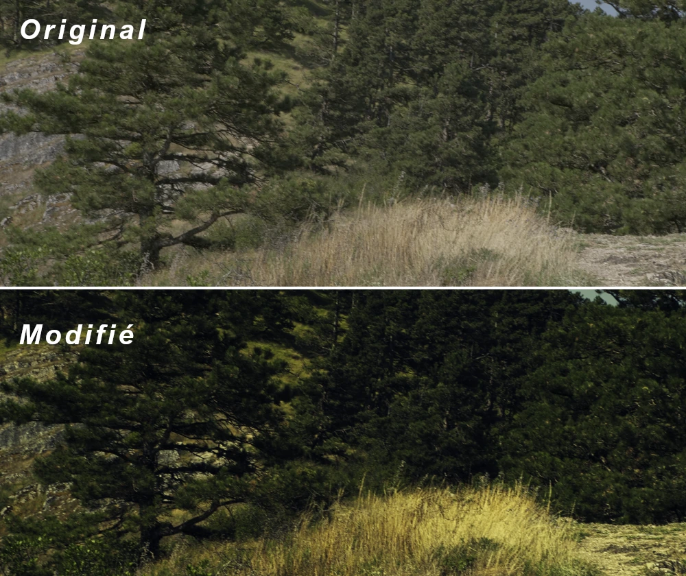 Sachant que seuls les plans d’introduction qui présentent le paysage de la Montagne Noire sont exploitables, il s’agit maintenant de faire du maquillage… C’est à dire de manipuler la colorimétrie des images afin d’en augmenter la noirceur.